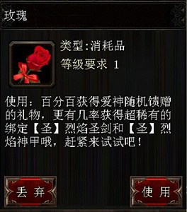 玫瑰不仅仅是浪漫佳节的装饰,玩家将其打开后更是有大大的惊喜。开启《烈焰手游》七夕玫瑰能百分百中奖,有机会获得神装、极品飞升装备、高级套装等超级大奖。而运气好的玩家,更有机会获得绑定的[圣]烈焰神甲和[圣]烈焰神剑绝世神装。