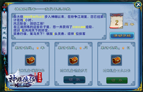 8月20日更新后,主界面将开启神雕2周年时光机按钮,点击开启专属于你的时光记录。年、月、日专属单位,精确记录在线时间。8月22日12:00,庆典开启之时,时光机将为你带来在线专属奖励。还记得自己有多少时间在神雕江湖中流连忘返了吗?8月22日,神雕2周年庆典,时光机悄然开启,细数你在神雕江湖中的一分一秒。