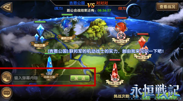 公会战开始前,系统会自动根据公会积分进行对战公会匹配,积分相近,且连胜数相近的公会将会被分配为对战双方,公会战的胜负结果将会影响公会积分。公会积分直接决定公会排名,公会排名越高,每天获得的公会奖励则会越丰厚。值得一提的是,公会战中增加了有趣的【弹幕】系统,玩家可以通过发送弹幕来给己方的战友加油打气,也可以吐槽敌人,扰乱敌方军心。吐槽达人们,你们的机会来了!