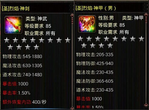 完爆一切装备的《烈焰手游》[圣]烈焰套装拥有惊人的属性,玩家单纯佩戴任意一个,就能获得超恐怖的属性加成。如[圣]烈焰·神剑的物理攻击、魔法攻击和道术攻击属性值超高,其中物理攻击就有将近2000的巨大属性值。