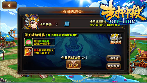 普通、精英副本就不够过瘾?想要无限闯关,那就来通天塔吧,怪物会不断刷出,每5层小BOSS,每10层一个大BOSS,玩家根据排名获取奖励:无字天书(升级主将技能)、宝箱钥匙、大量银币;并且系统会对每日前10名的玩家,进行元宝奖励,事不宜迟,赶紧来挑战吧!