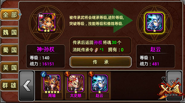 为了进一步优化玩家的游戏体验,在9月新版中,《X三国》将推出兑换,福袋,聚宝盆以及传承等全新的功能!从此以后,兑换武将,装备以及道具的操作就将更加便捷咯!另外全新的传承系统也很值得关注哦,主公们可以把不再宠幸的武将打入冷宫,而他的等级进阶,突破,技能和修炼一并传承给30级以下的新武将,一键传承就能打造全新的主力武将,是不是有点梦幻色彩呐!