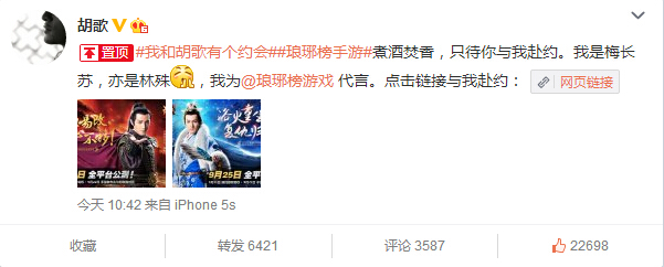 “浴火重生,复仇归来”由掌上纵横、乐元素、爱奇艺联合发行的2015古装RPG手游史诗《琅琊榜》于9月11日开启了“我和胡歌有个约会”预注册活动,抢先预约即有机会与游戏代言人胡歌面对面,赴梅郎一面之约。知名古风音乐人“音频怪物”亲自操刀为《琅琊榜》手游制作的主题曲《风起忆琅琊》,今日首度揭晓,为即将于9月25日上线的游戏再添热度。