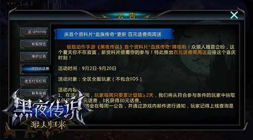 特大喜讯!新版资料片“血族传奇”已经到来,为了这个喜大普奔的日子,我们决定冒死派大礼!玩新版《黑夜传说》,每周送出一部iPhone6!活动详情请见游戏内公告。