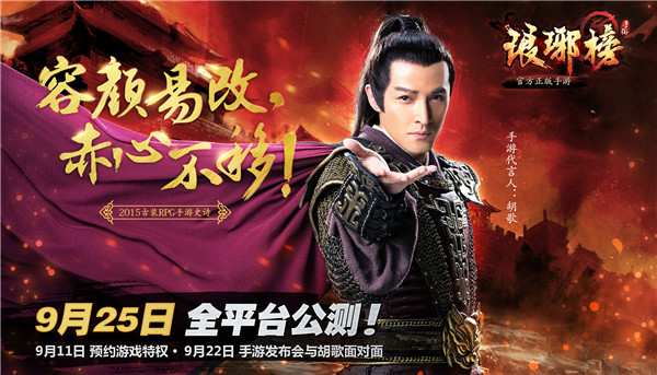 “浴火重生,复仇归来”由掌上纵横、爱奇艺、乐元素联合发行,2015古装RPG手游史诗《琅琊榜》将于9月25日全平台公测,同名电视剧也将于明日开播,届时电视、手机跨屏联动,体验精彩剧情,收集琅琊群英,更有梅郎胡歌走入游戏全程原声陪伴。现在参加游戏预注册,就有机会亲临手游发布会,与胡歌面对面!