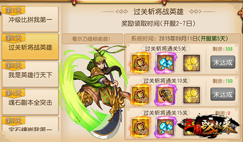 第二重豪礼送给玩家的是以斩将积分为主的奖品。完成主线任务过五关斩六将即可开启过关斩将功能,只要玩家在副本页面中点击过关斩将即可挑战,挑战到达第5关、10关、15关的时候就可分别领取相应数量的斩将积分、钻石、金币等。
