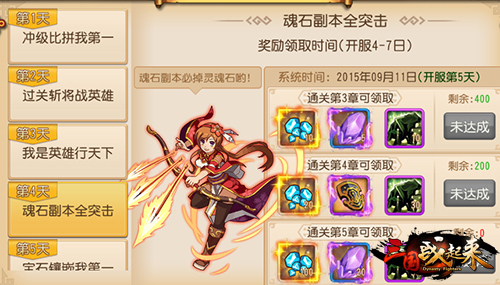 第四重好礼送给玩家的是以复活石和钻石为主的奖品。副本是装备和魂石获得主要途径,副本分为3个内容‘装备副本’‘魂石副本’‘过关斩将’。完成主线‘刘备出道’开启装备副本。并通关到第三章、第四章和第五章时,就可领取到相应数量的复活石、英勇奖章和钻石等。
