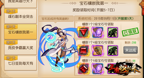 第三重豪礼送给玩家的是以召唤神石和经验丹为主的奖品。玩家只要在游戏中搜集到7名、10名和15名武将的时候就可以领取相应数量的召唤神石、经验丹和金币等。顺便一提,多多搜集武将进行英雄进阶是提升战队战斗力的核心关键。