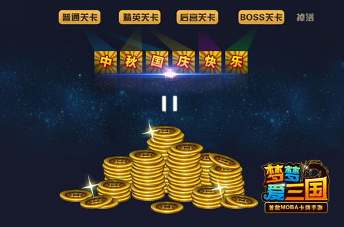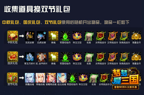 在活动期间,关卡掉落的双节专属道具共有“中秋国庆快乐”六种,可以单独使用也可以兑换中秋礼包或国庆礼包。如果集齐六种道具,还能直接兑换最具惊喜的“双节大礼包”,不仅有海量金币、经验、后宫道具,更有天下英雄梦寐以求的“金装”“坐骑”和“红卡战魂”哦!有了强大的红卡,再也不惧天下任何高手!