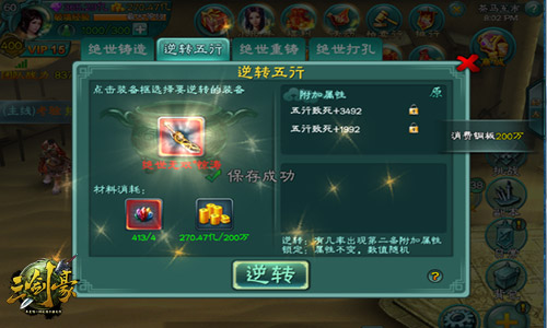 对于红色装备只能随机一条属性而感到不满足?认为真正的超凡装备应该五行平衡?来体验全新的“逆转五行”功能吧!经历过逆转五行的红装不仅有几率出现五行属性的类型改变,更有几率获得第二条五行附加属性,使原来的红装更加绝世而独立!