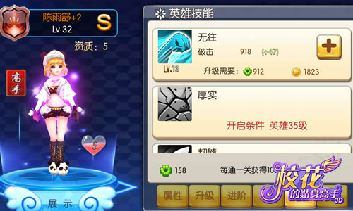 《校花的贴身高手3D》当中的技能系统除了传统观念中的主动释放绝技大招以外,也包括了不同的技能属性加成,值得注意的是,主角与各个英雄所拥有的技能均有所不同。这就代表着想要获得平衡的全方面发展,可能需要兼顾到每一个英雄技能搭配所产生的效果,不失为高智商玩家的福音哦。