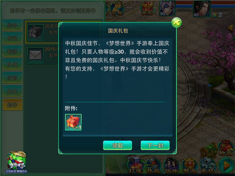 每逢过节,自然少不了我们的礼物仙子为大家送温暖,本次双节来袭,玩家领取的节日自然也是双份,只要等级达到20级的玩家,在中州城195.130处点击礼物仙子,即可获得节日礼包,海量金钱、海量宝石、海量宝图随意送,轻轻松松,点击即拿。除此以为,《梦想世界》手游外特意为广大玩家准备了丰厚国庆大礼包,千万不要错过哟。