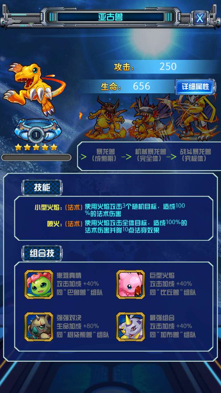 亚古兽是小型爬虫型数码兽,虽身体弱小,但十分勇猛,无所畏惧。亚古兽是五星型的数码兽,初始战斗力比较弱,但是容易获得,而且培养到后期的话十分强大,其战斗力不亚于七星数码兽。