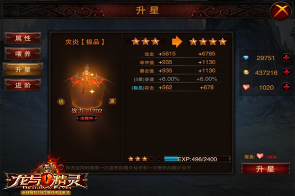 至尊极品精灵的养成系统有三大组成部分,精灵的喂养、升星和进阶。喂养可以提升精灵的等级,需要喂食精灵口粮来完成,精灵等级的提升,是精灵进阶要求的重要条件之一,而精灵进阶的另一个条件就是升星。精灵升星需要消耗生命精华,生命精华可以在精灵试炼、商城购买和精灵抽取中获得。蓝色品质的精灵最高可以提升到15级3星,满星满级后方可消耗紫色羽毛进阶为紫色精灵。紫色精灵满级30级,满星4星,满星满级后方可消耗橙色羽毛进阶为橙色精灵。橙色精灵满级50级,满星为5星精灵。精灵品质属性分为初品、下品、中品、上品、极品。如果你有一个橙色的初品精灵,又在抽取过程中获得了一个极品的蓝色的精灵,那么恭喜你,你的橙色初品精灵刻就可以升级为极品精灵。需要强调的是,不管是精灵的喂养、升星和进阶,都能极大的提升精灵的作战能力。
