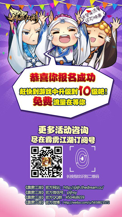 为了庆贺安卓上线这件“江湖大事”,《霹雳江湖》(pljh.thedream.cc)特别推出“玩游戏送流量”活动。只要在活动专题中报名(可通过官方微信号:pljhsy进入),并在游戏中将账号升级至10级,就有机会获得24G包年流量,即日起至10月30日18时,每天都有流量“壕”礼相送。