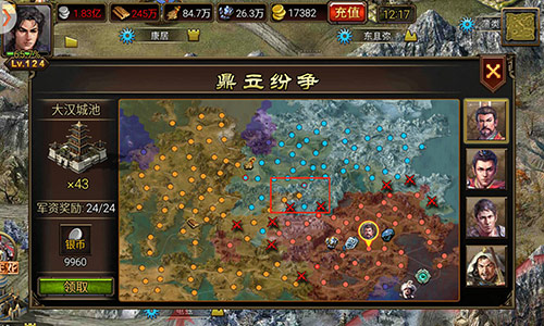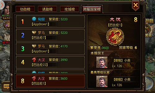 《天将雄师》三大势力:大汉、罗马和匈奴瓜分天下,161座城池关卡和3个蛮族城池供玩家调兵遣将,攻伐城池。当玩家移动到非本国所属的城池时,战争随即触发,击败该城所有NPC或玩家即可占领该城池。所属城池越多,可收取的赋税就越多。另外,击杀他玩家数量最多者,即可登上世界地图的杀敌榜,享受万人敬仰的无上荣耀!