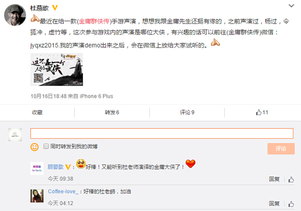 杜燕歌担任配音顾问 微博被刷屏