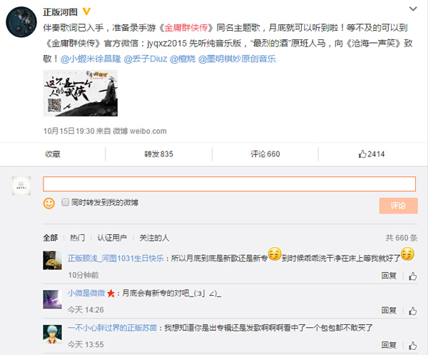 河图有什么动态,“小老婆“们的信息来源总是超前的。日前,担任《金庸群侠传》音乐顾问的河图发表最新微博,透露了将为游戏创作新歌的信息,正是这则微博瞬间拔高了粉丝们的期待值。根据计划,河图将亲自演唱《金庸群侠传》的主题曲,目前纯音版的试听已经在《金庸群侠传》官博放出。在高达四位数的留言中我们看到,不只是河图的粉丝对新歌充满好奇,还有相当多的金庸粉也乘此机会留言询问游戏和主题曲的最新进度。可以看出,手游《金庸群侠传》作为知名武侠IP的正版作品,它能够带给玩家们的不只是曾经的青春记忆,还体现了从少年走到青年的他们热情不灭。