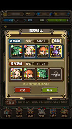 从主界面菜单进入硝烟弥漫的“战场”。这里是天下英雄必争之地,竞争自然是相当激烈。排位赛,顾名思义,就是排位次序的战争。每个上阵英雄都有自己的阵型和阵容,不过,我们只能查看到敌方的一部分上阵英雄,其他的,只能通过战力综合来估算了——这便给排位赛带来了一丝不确定因素,需要您费点脑子去斟酌咯!