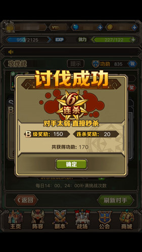 攻伐战又是另一个凶残的战场玩法,在8次挑战次数里,您需要尽可能地去挑战实力与自己相当的对手,获得尽可能多的功勋奖励,以证明您英雄的实力。这是一个“杀人不见血”的残酷之地,上阵英雄、走位方法、合击策略,都能影响最终的战况。