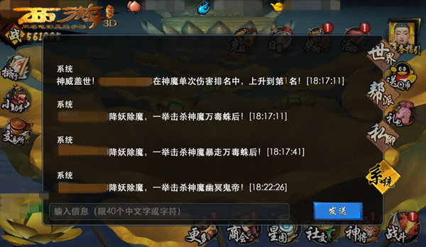 聊天系统优化——在原有“世界”和“私聊”的基础上,新增“帮会”和“系统”模块。让玩家更便捷的选择自己的朋友圈进行聊天。