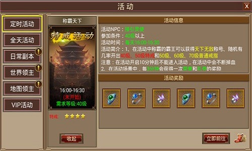 当然,作为一个大型PVP副本,称霸天下绝不止是环境恶劣那么简单。在副本中各位大侠的PK模式将被强制设置为全体模式,铁血厮杀就此开始!优胜劣汰、弱肉强食,战场法则的残酷在此锋芒毕露!在称霸天下的副本中被击杀后,大侠将会被强制离开战场,退出副本,而10分钟后入口将被关闭,此后只出不入,直至副本中剩下唯一一位存活的胜利者。这位大侠将独享特有称号“天下无敌”,且将有可能获得《屠神》终极戒指——“特戒”!当然,其余参与者也绝不会白来!因为只要每在活动场景中存活3分钟,就将获得一次荣誉和奖券的奖励!