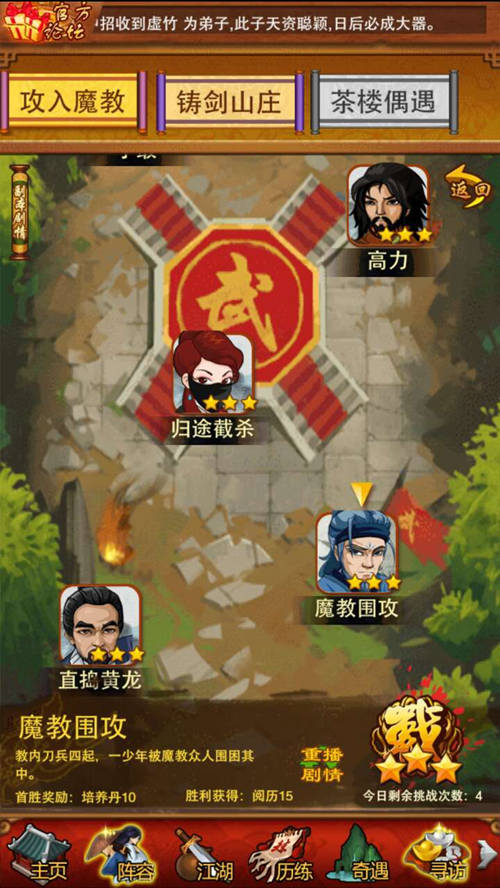 魔教藏匿之处已经发现,剿灭即可了解其背后鲜为人知的目的。但魔教实力深不可测,想要战胜并非易事。各位掌门要加紧提升弟子的实力哦!