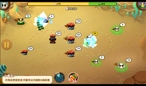 当你在对战过程中即将失去自己的兵营,可以借助道具秒杀敌方。《美味战争》游戏中有7种道具,有萝卜火球,冰风暴,这些道具都是可以让你瞬间扭转局势,因为这道具一出,你就能消灭对方的兵力,或者冻住已出的兵力。其他的道具还有增加时间、增加兵力的等等,这些都需要各位玩家亲自体验才能了解其中的快感。不过这些道具最让人无语的是,在控制对手的同时自己的军队也有可能受到影响。如果冻住对方的军队,自己的军队也会无法移动,用火球烧掉对方的军队时,己方离得近的也可能遭殃。如果你也遇到这种问题以为这是BUG,其实不然。但是小编并不觉得这样的设计有用。