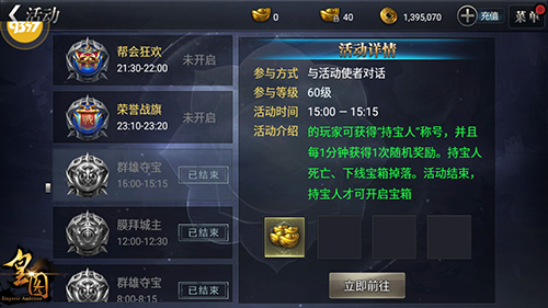 9377《皇图》当中的“群雄夺宝”为一个日常活动玩法,会在每日的8:00-8:15以及15:00-15:15这两个时间段开启,所有等级达到60级或者以上的玩家均可以自由前往参与。“群雄夺宝”活动地图为危险区域,所以玩家们在专心寻找宝物的时候,也要时刻提防其他玩家的偷袭。