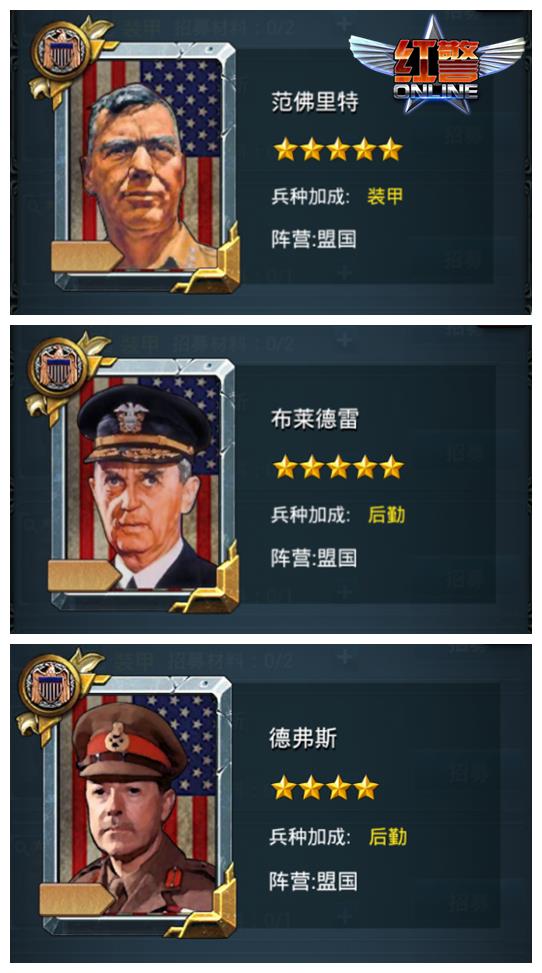 此次五星战将的全新亮相为三大阵营带来了全新的战术战略的升级,三大阵营共12位二战名将进入战局,玩家可通过名将寻访及每日消耗积累的方式获得人物碎片,值得注意的是,只需要一个碎片就可以召唤一位将军为你效力,还在等什么?将他们招至麾下为你而战吧!