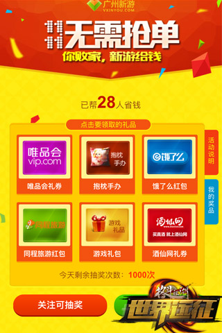 《格斗江湖》“11.11无需抢单,你败家,新游给钱”活动是由广州新游网络有限公司跨界与唯品会、饿了么、同程旅游、酒仙网等公司强强联手推出的光棍节购物狂欢,一共送出超过千万元的购物券,让各位玩家无需为荷包心痛尽情享乐!