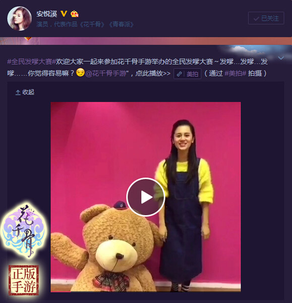 《花千骨》电视剧中糖宝的扮演者安悦溪,今日在新浪微博中正式宣布代言《花千骨》手游。此前她与花千骨手游互动频繁,近期刚结束的发嗲大赛中,安悦溪的嗲萌形象表演让人对其印象深刻。