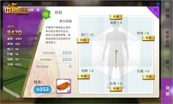 在《中超风云》中,球员均具有6个维度属性,分别为:传球、带球、射门、拦截、抢断、扑救。所有的属性随着球员的升级和转生而等比例提高。除此之外,球员还会从低到高分为白、绿、蓝、紫、橙5种品质,品质越高的球员,基础属性越优秀。