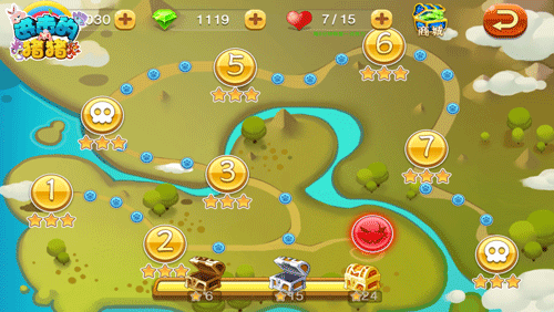 此外,通关后系统将根据战斗获得的分数为玩家的战斗表现进行评级,每一关有3个等级的通关评级--一星、两星,三星,当当前地图内玩家通关所获得的星星到达一定数量后,还可开启额外的阶段宝箱,阶段宝箱一共有三个,其中含有金币、炸弹、钻石奖励,所以为了能够顺利开启所有宝箱,就需要保证自己尽可能获得更多的星星。