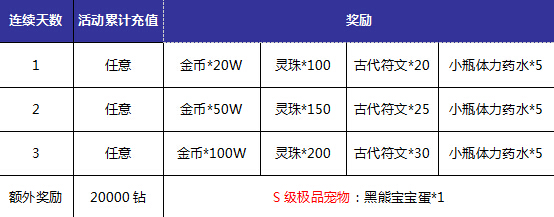 活动规则:活动期间,连续充值天数达到条件即可获得额外奖励,总充值额达到20000钻石,更能获得S级宠物-黑熊宝宝,祝您称霸天下(奖励由邮件发放)。