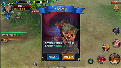 在9377《女王号令》的大陆之上,埋藏着很多尘封的宝藏,玩家只需要获得藏宝图,就有机会根据藏宝图上记载的位置获取到大陆之上的宝藏。只不过,宝藏也不是那么容易获得的。凡是埋有宝藏的地方,就必定伴随着众多机关。一不小心进入虫洞、意外激怒宙斯被雷劈身亡、遭到大量妖怪围殴等等,都是挖宝常见之事。