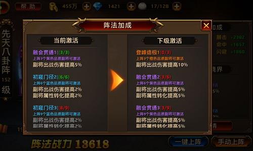 在《刀锋无双》中开启阵法系统后,各位主公即可选择武将进入阵位,若是怕麻烦,也可以点击一键上阵,系统将自动匹配战力最高的武将进入阵位。阵位中武将的品质和星级越高,提供的战力加成越高。而当主公们上阵的武将达到3、6、9个紫色以上品质时,即可激活境界属性。如上阵3个紫色品质副将可激活融会贯通境界,副将出战伤害将提高5%,而上阵3个橙色品质副将可到达登峰造极境界,副将出战伤害提高10%。所以各位主公在升级阵法的同时,也要记得培养武将哦!