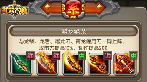 传世神兵的流芳千古绝不是纸上谈兵,经多少代帝王将相的历史沉淀,七星龙渊与其他帝王神兵命运相连,由此激发出“神龙”印记,即《武器大师》神兵图谱中隐藏的“系”羁绊特色。七星龙渊但若与龙舌、龙鳞、屠龙刀、青龙偃月刀同时上阵,即将触发“游龙绝杀”的龙皇霸绝杀意,作为所有系羁绊中战斗指数最高、攻击力加成最高的隐藏羁绊,将其赋予无坚不摧的力量,这才是帝王之剑、君子之剑的英雄本色。