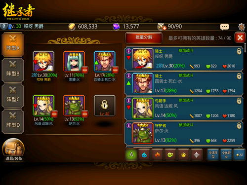 此外,在上阵英雄的排列和药剂的补给上也要有所策略,由于上阵的英雄只有五个,建议走“有奶有肉有输出”的均衡策略,血厚耐抗的守护者(但丁。洛克)负责在前排抵挡住敌方的攻击,再带上一位负责加血的奶妈和一位弓箭手、一位骑士负责强力输出,最后一定要记得带上治疗药剂。若不幸战斗失败,还有机会获得英雄召唤券、高级制造材料、紫色制作卷轴等等,也算是失败后的安慰奖了。