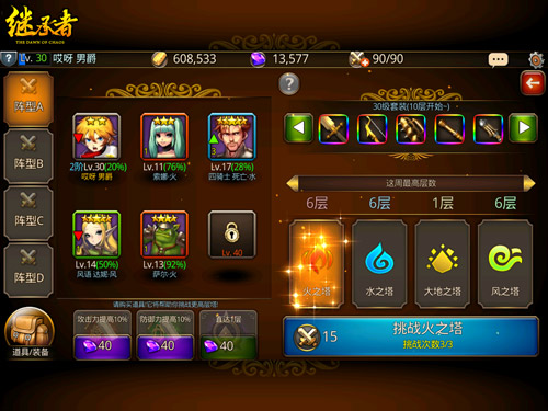 无尽之塔一共有4座属性塔,分别是火之塔、水之塔、大地之塔、风之塔,每座属性塔都有30层。挑战至10层以上有机会获得30级职业套装,挑战至20层以上有机会获得40级职业套装,到30层时,有机会获得50级职业套装。但无尽之塔里的怪物不仅战斗力十足,怪物数量也相当多,还不停的呼唤援军。而英雄只有五个英雄,死亡后就无法再复活了,因此,搭配好英雄显得格外重要!