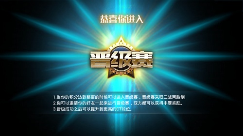 玩家通过挑战并提升自己的段位,获得更多奖励。排位赛共分为积分赛部分和晋级赛部分。CT大赛时首先进行积分赛,参加积分赛胜利可以增加排位积分,战败则减少排位积分,当前排位积分大于等于100时获得晋级资格,并进入晋级赛提升自己的段位;若玩家当前积分掉到了小于0,则玩家的段位则下降。