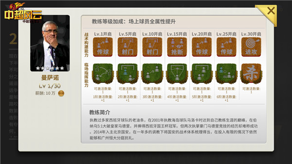 如果你也希望能邀请到曼诺萨成为你《中超风云》手游俱乐部的主教练,那只需通关2014年外传,就可获得曼诺萨青睐,有机会将这位西班牙教练招致你的麾下。