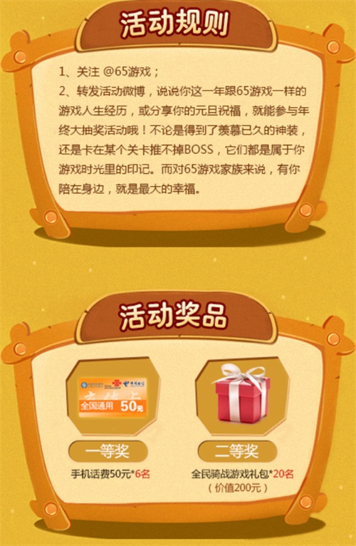 少年,你的新年礼物已经在路上。65手游《全民骑战》在从1月1日开始,在65游戏官方的微博投入海量豪华好礼,小伙伴们想要礼物,现在就赶紧关注,还来得及。目前据可靠情报,新年大礼可能有:手机话费、新年限量礼包激活码等,想想就有点小激动。新年新气象,中个大奖,说不定一年都有好运气!