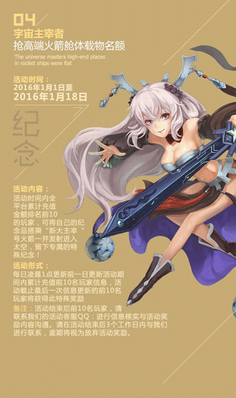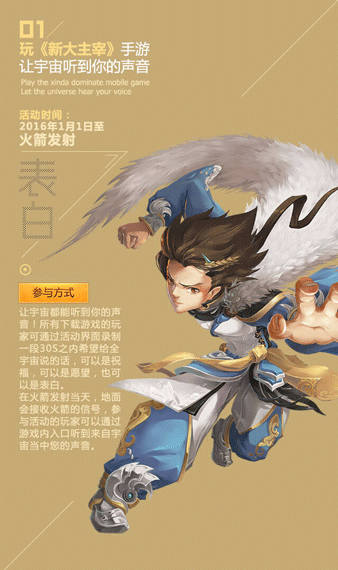 太空表白,浪出天际!活动期间,所有下载游戏的玩家可通过游戏中的语音系统录制一段30s之内的语音信息,可以祝福火箭,可以新年许愿,可以表白男神女神!“新大主宰号”火箭升空后会将您发送的声音信息向茫茫宇宙传播出去。在火箭发射当天,地面会接收火箭的信号,参与活动的玩家通过游戏内入口就能听到来自太空的您的声音啦。