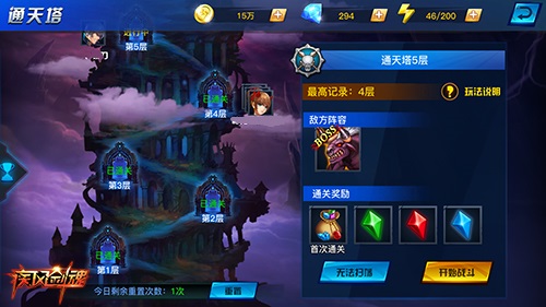 通天塔每层均有不同的BOSS守卫关口,在击杀成功之后,有几率获得不同等级、不同种类的宝石。首次进入通天塔需要从1层开始,进入通天塔战斗场景,你必须需要在1分钟内使出浑身解数消灭守关BOSS!当然,你也可以在通关后进行扫荡,轻松快速获得大量宝石,省时省力哦~