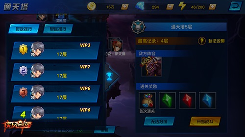 塔中怪物个个身怀绝技,如果在爬塔过程中不幸扑街也请不要放弃治疗~!在通天塔挑战没有次数限制也没有体力消耗,你只需要调整战斗方案再战即可~此外,如果你苦苦思索也不得启发,你还可以使用“丢肥皂”和“抱大腿”大法进行求助→点击通天塔页面的左侧奖杯图案,可以查看到当前好友的爬塔进度,向领先你的好基友“丢肥皂”勾搭请教爬塔技巧吧~如果你还嫌不够,还可以查看【单区排行】,向全服的爬塔大神跪求秘诀,从此走上抱上大腿的爬塔之路啦!