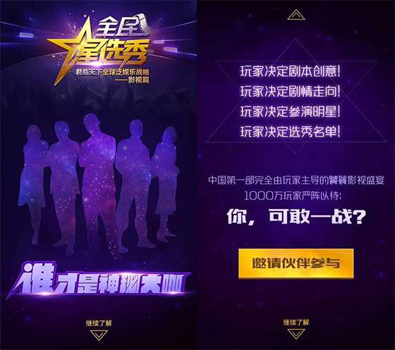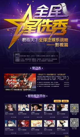 “全民星选秀”是《君临天下》的游戏发行方“游久游戏”,联合游戏开发商“擎天柱”、影视公司“聚米金融”、大型原创视频社区“爱拍原创”、O2O社交工具“报名吧”、中国首个美女造星孵化平台“女神TV”,以及全国十所着名高校,震撼开启“君临全球泛娱乐战略”首站“影视篇”中重要环节。