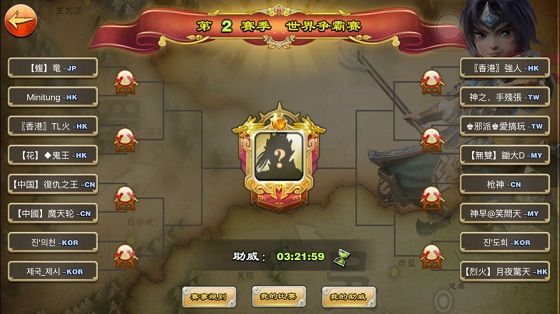 《君临天下》“世界王者争霸赛”是全球三国迷的竞技盛典,中国大陆、中国香港、中国台湾、韩国、日本、新马、美国,七大赛区的主公们奉献出一场场精彩漂亮的策略三国之战。世界16强玩家两两分组,进行BO3赛制,胜出者晋级下轮比赛,谁将成为世界最强王者让我们拭目以待。