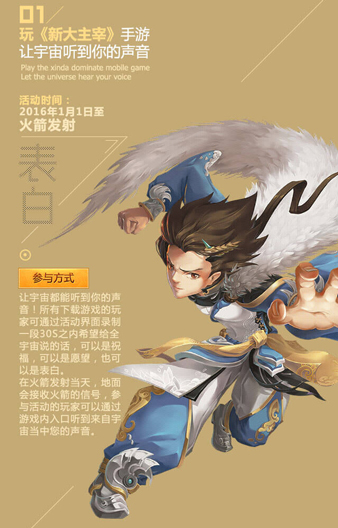 看了以上玩家的“杰作”,你是不是也想加入到调戏后台的耳朵的活动中来?“太空表白”计划期间,所有下载游戏的玩家可通过游戏【语音火箭】界面录制一段30s之内的语音信息,可以祝福火箭,可以新年许愿,可以表白男神女神!在火箭发射当天,地面会接收火箭的信号,参与活动的玩家通过游戏内入口就能听到来自太空的您的声音。