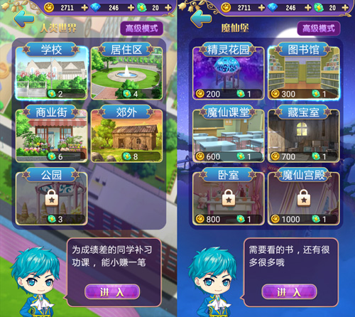 养成玩法更加丰富,女生们应当是都很喜欢的~此次升级,不仅故事情境、场景情节等都有了大幅增加,具体的模式设计上也有了更加丰富的玩法。在主界面点击“外出”可以看到三个选择:“打工”、“培养”、“闲逛”,大大增加了故事情境的丰富性。你可以选择“打工”,消耗体力以赚取一定的金币,你可以去学校帮成绩查的同学补习功课,去居住区帮忙打扫卫生也能赚取不少金币呢。当然你也可以选择“培养”,去到魔仙堡的精灵花园或是魔仙宫殿,用上一些金币和体力好好地提升自己的能力!在游戏中,我们要注意的是合理分配自己的体力跟金币,让小魔仙得到最大的提升~当然无论是人类世界还是魔仙堡都很有意思的呢,你可要努力赚钱都去逛一逛呢~